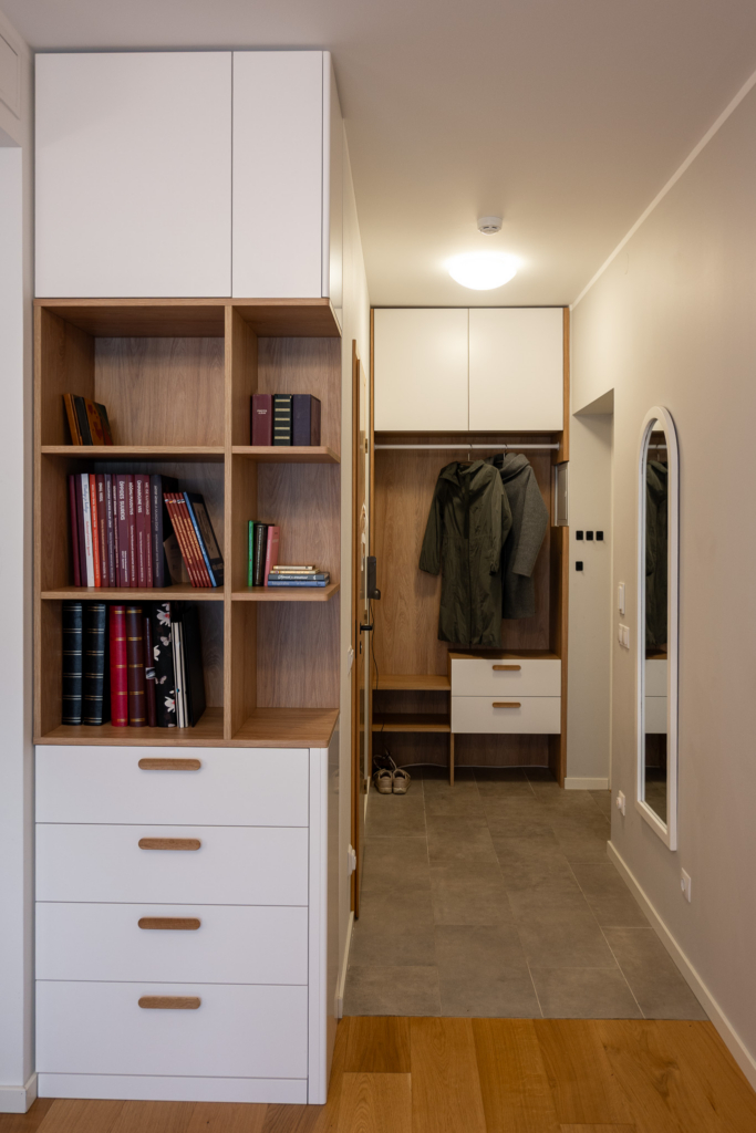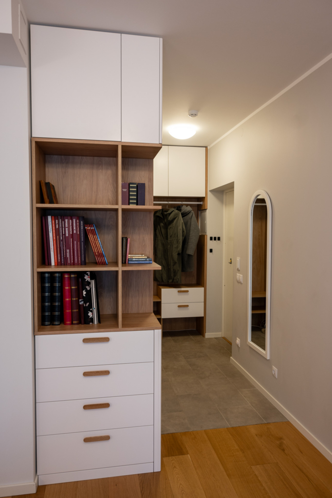 Käesolev projekt sai alguse kliendi soovist leida oma väiksesse korterisse täiuslik esiku- ja elutoamööbli lahendus, mis oleks ühtaegu mahukas, praktiline ja säilitaks samas ruumis õhulisuse. Kaupluste valik kippus siinkohal napiks jääma ja just see ajendaski klienti minu poole pöörduma, et koos luua eritellimusel mööblidisaini, mis arvestaks tema kodu eripärasid.