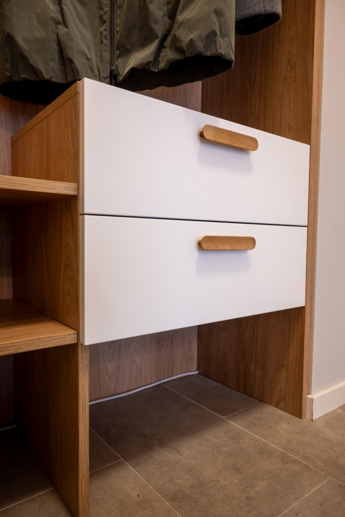 Nii sai loodud elegantne ja funktsionaalne mööblikollektsioon, mis ühendab endas kvaliteetse värvitud mööblikilbi koos lamineeritud lahendusega. Puidutooni soojus koos puhta valgega loob mõnusalt harmoonilise ja kaasaegse kontrasti. Naturaalsest tammepuidust käepidemed lisavad mööblile käsitöölist touch’i ja Kalamaja hõngule omast kvaliteeti.