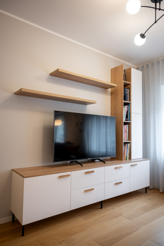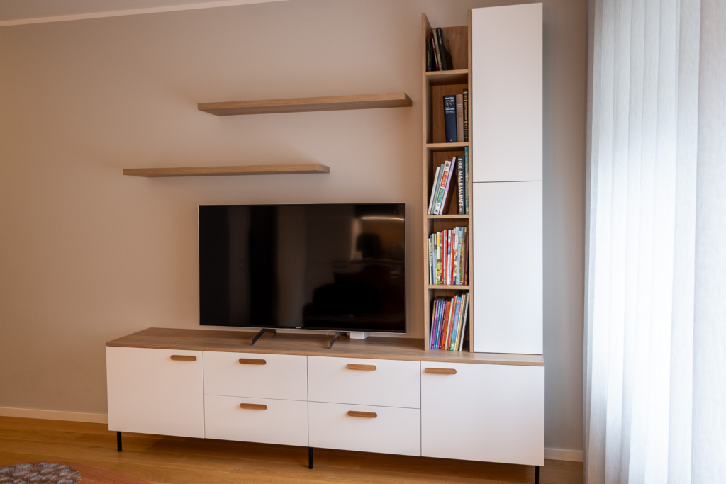 Põhiliseks eesmärgiks oli luua mööbel, mis lahendaks vajaduse TV-kapi, raamatukapi ja esikulahenduse järele, pakkudes kodule suurt hoiuruumi (eriti kliendi ulatuslikule raamatukogule), kuid seda ilma väiksemat ruumi visuaalselt üle koormamata. Disaini loomisel sai seetõttu lähtutud nii ümbritsevast miljööst, Kalamaja piirkonna hõngust ja kliendi olulistest soovidest. Protsessi käigus panin kokku kõigepealt 3D visuaalid, seejärel mööblijoonised ja lõpuks valisime ühiselt kliendile sobiva mööblitootja.