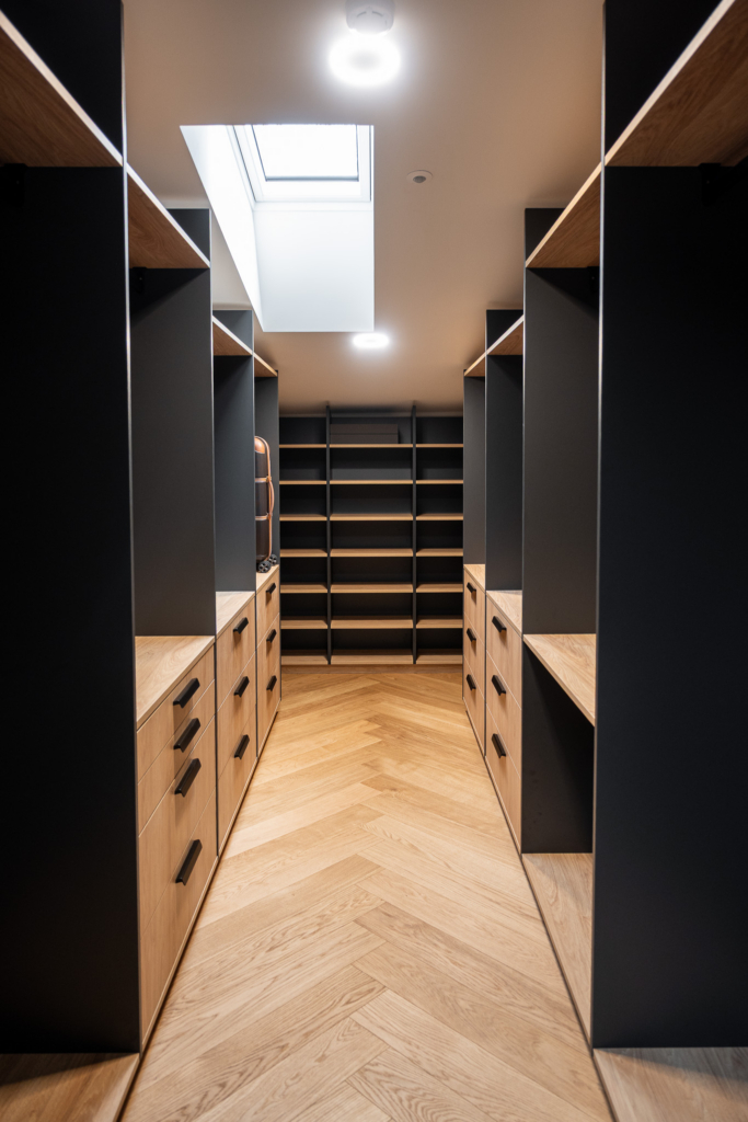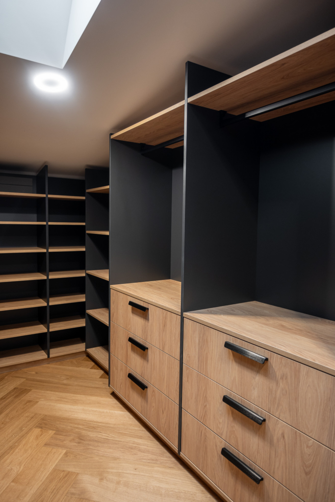 Käesolev projekt võimaldas perenaisele ja peremehele luua kaks eraldi isiklikku garderoobi, kahele kitsale katusealusele pinnale. Mööblidisaini etapis sai kaalutud mitmeid versioone, sealhulgas ka elegantset lahendust klaasustega. Paraku on praktilisus sellistes ruumides esikohal – kuna ruumid olid vaid ligi 2 meetrit laiad, oleks uste avamine siin ruumides tekitanud ebavajalikku liikumistakistust. Seetõttu tuli seekord sellest ideest loobuda, et lõpptulemus saaks kliendi jaoks eelkõige mugav ja funktsionaalne.
