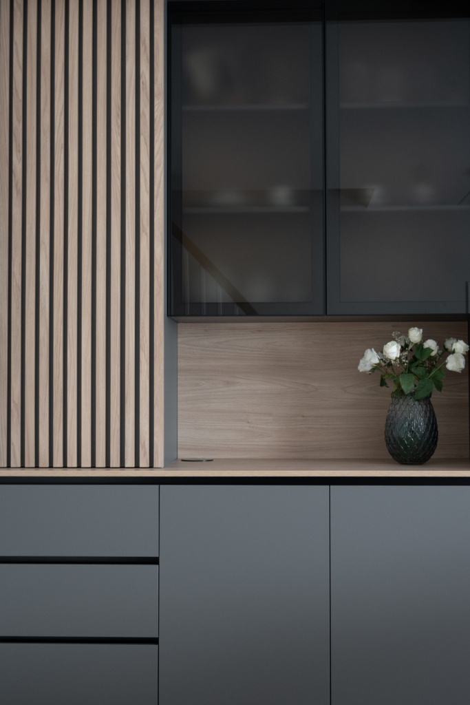 Mööbli aitas valmis toota Truut Intrior OÜ. Materjalidena on kasutatud Eggeri laminaadiga MDF’i, karkass melamiinist, L- ja C profiiliga mustad käepidemed. Uksed ja sahtlid vaikselt sulguvad, klaasuksed mati pronksklaasiga. Erilahendusena lisasime vahva nüanssi juurde veel ribipaneelist lükanduksega, millel kasutatud vaid ülasiini lahendust.